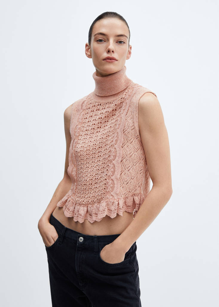 Midpoint. Straight design. Roll neck. Sleeveless. No Fastening. Ruffle detail. Openwork details