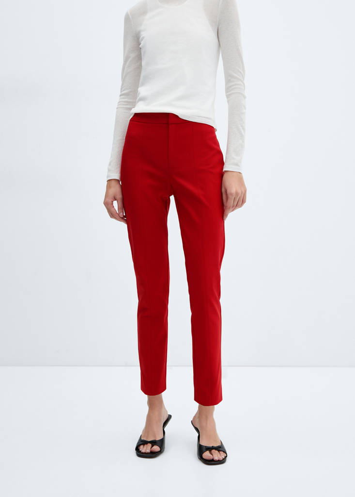 Cotton blend fabric. Skinny fit. Crop design. High waist. Two welt pockets at the back. Concealed button, hook and zip fastening. Office looks. Fitted design. Low waist. Straight design. Standard design. Mid-rise. Side slit hem. Zip, button and concealed hook-and-loop fastener with placket. Inner lining. Medium