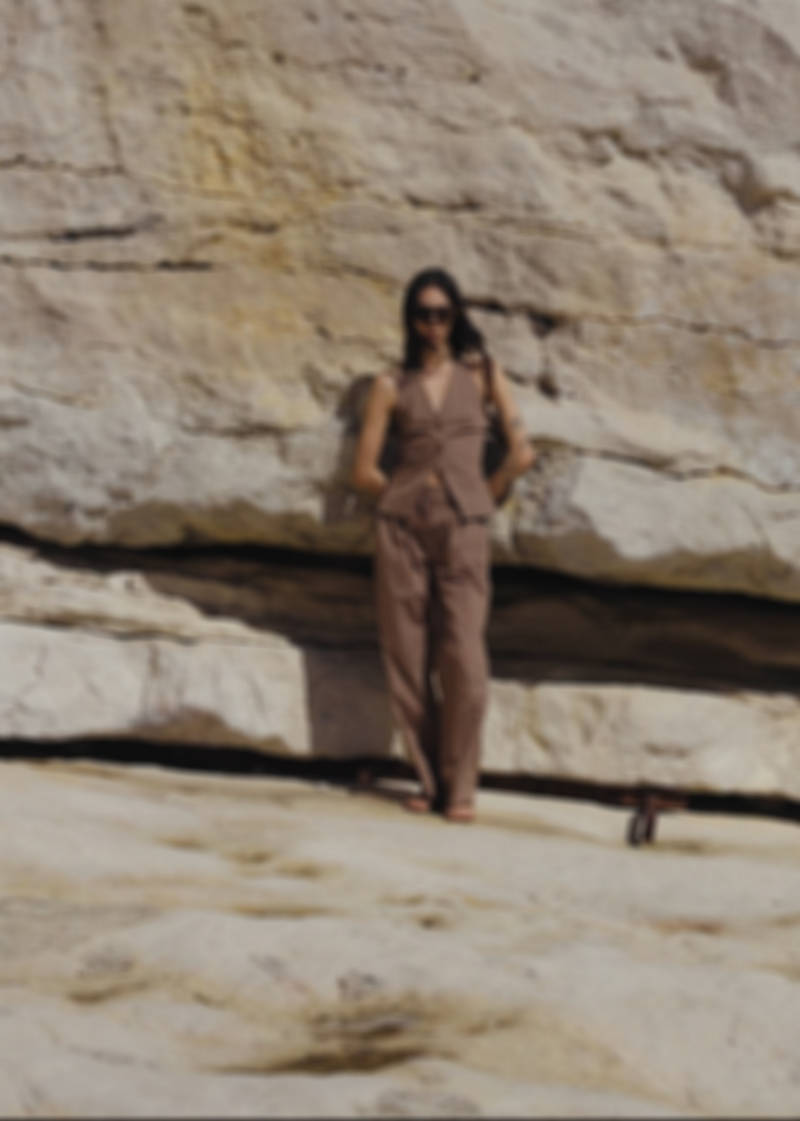 Cotton fabric. Straight design. Long design. Striped print. Dart detail. High waist. Belt loops. Two side pockets. Two welt pockets at the back. Zip, button and concealed hook-and-loop fastener with placket