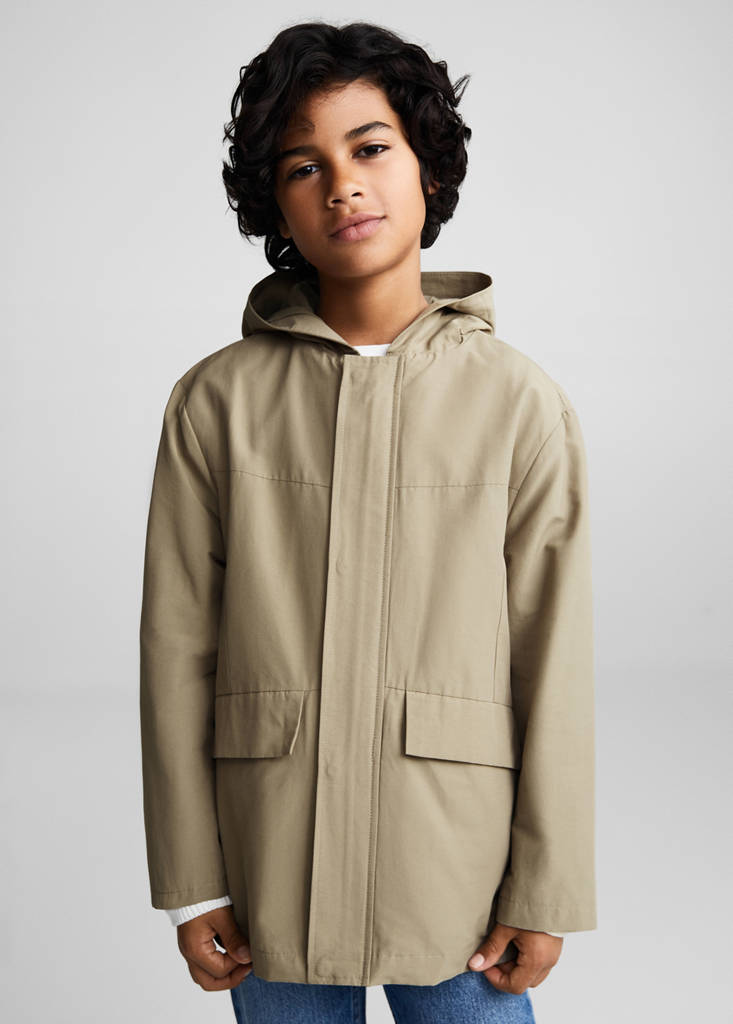 Lightweight fabric. Straight design. Medium design. Round neck. Long sleeves. Hood. Two pockets with flaps. Inner lining. Zip and press stud fastening