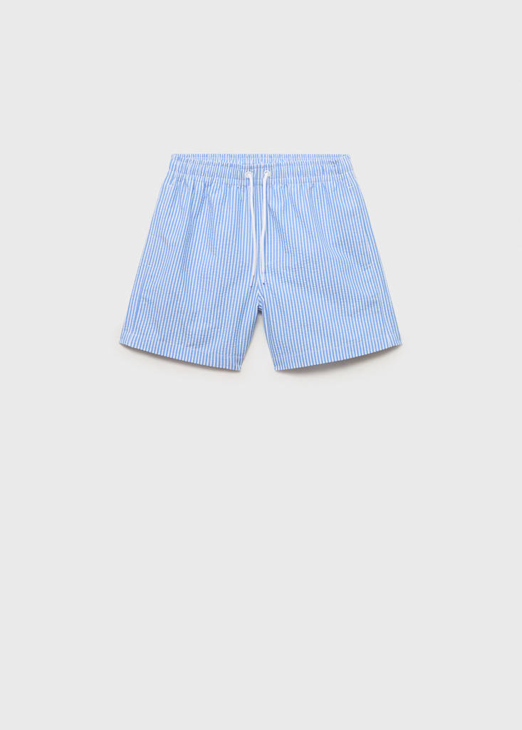 Cotton fabric. Seersucker fabric. Straight design. Short design. Stripe design. Elastic waist with drawstring. Back patch pocket.