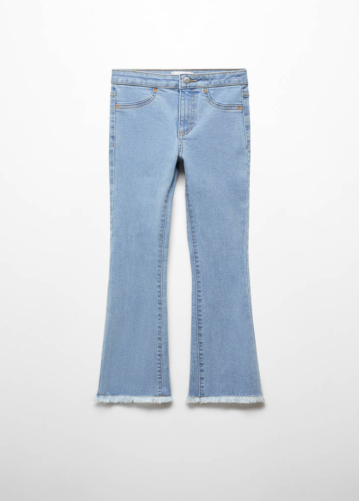 Denim-style cotton fabric. Straight design. Long design. Flare design. Mid-rise. Jeans with tie closure. Frayed hem. Zip and button fastening. Back to school. Belt loops. Five pockets. High waist. Denim fabric