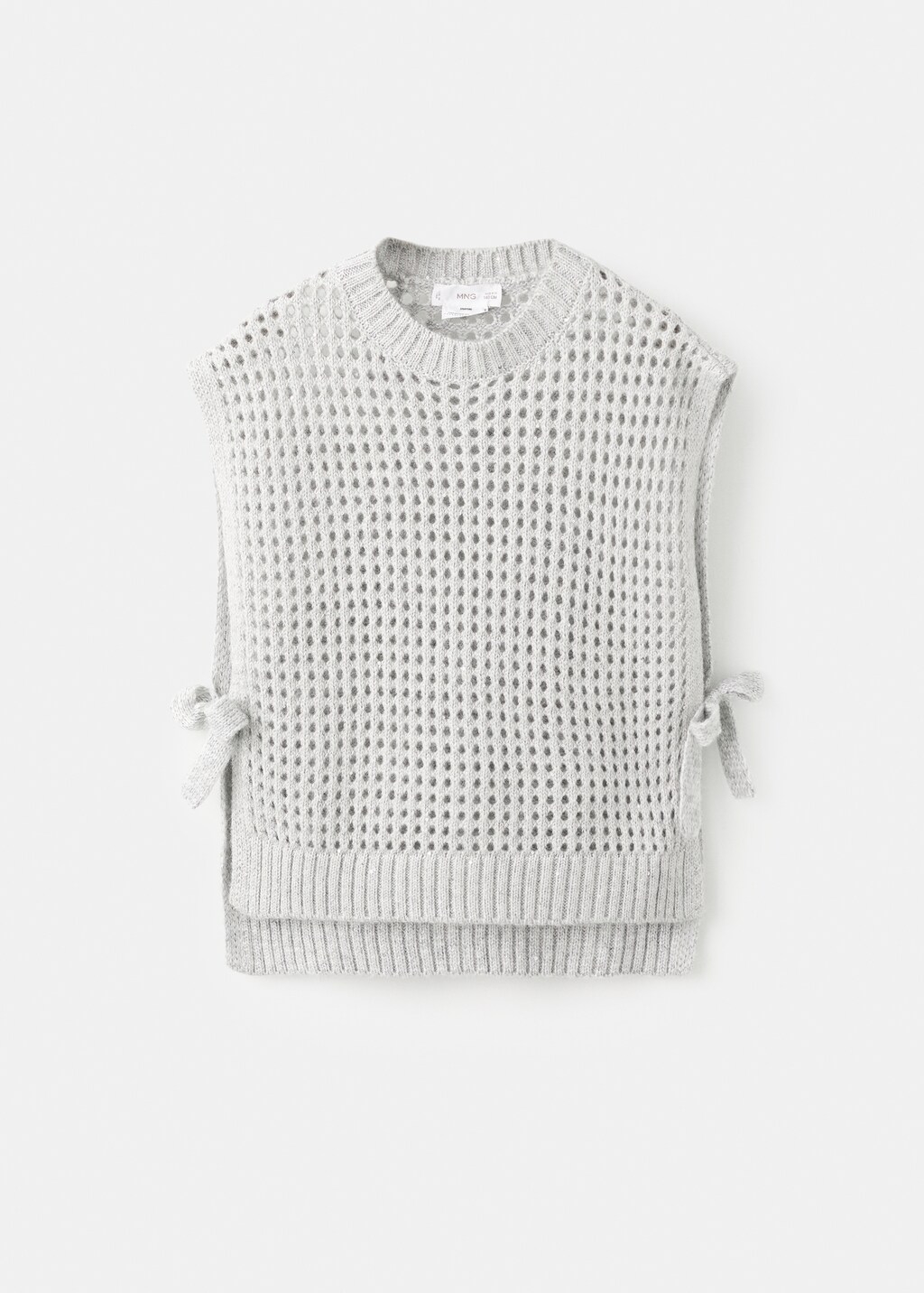 Knitted fabric. Lurex fabric. Crochet design. Glossy design. Round neck. Side bow fastening.