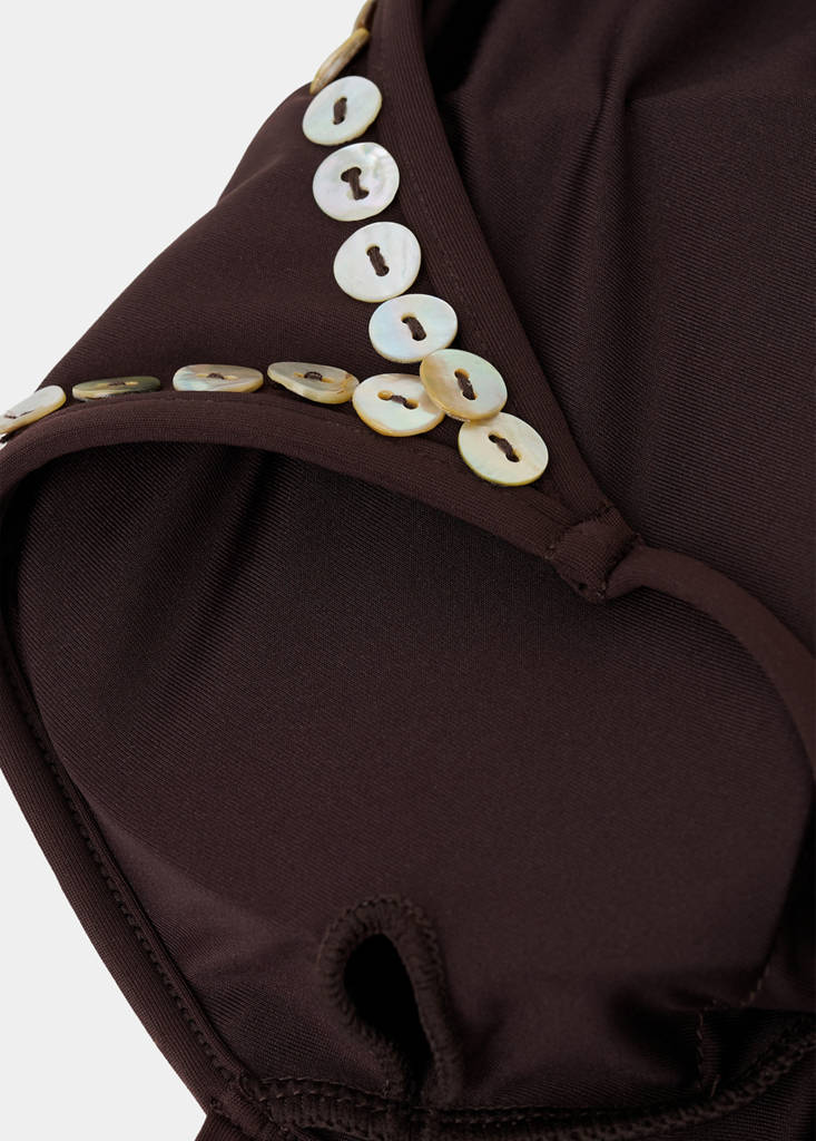 Asymmetric design. Thin strap. Decorative button detail. Open back. No Fastening. Detachable filling. Online Exclusive