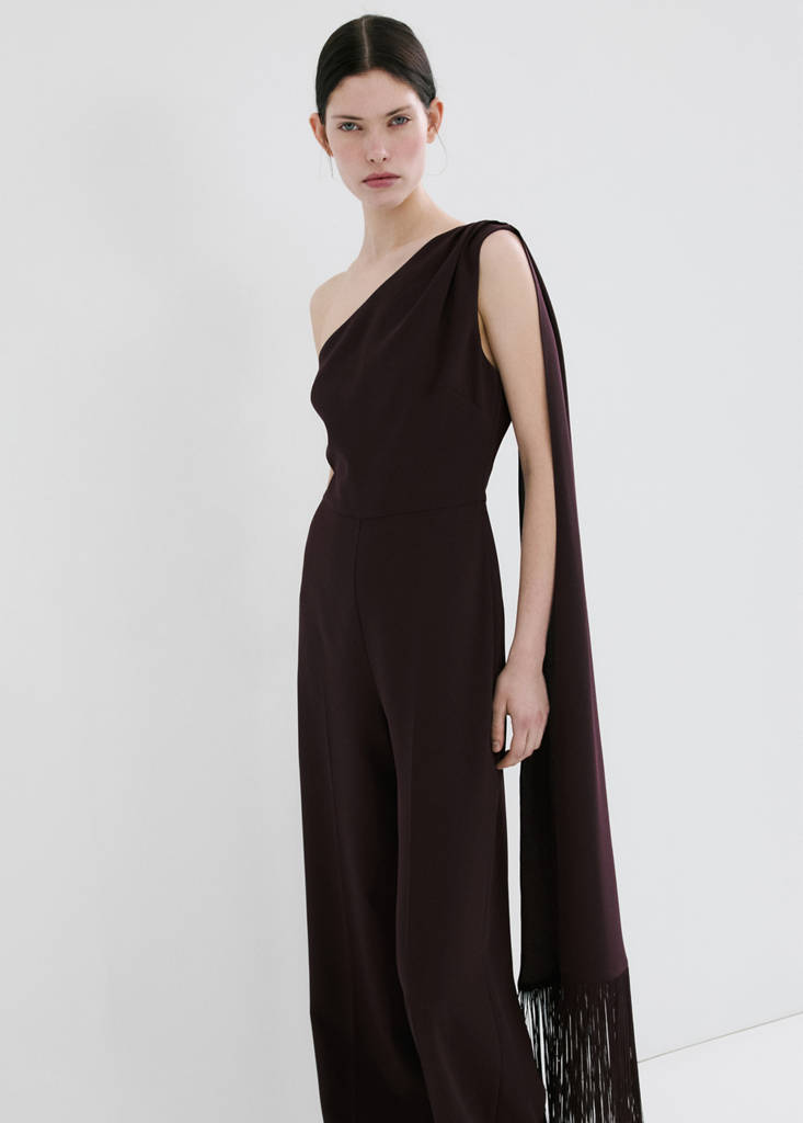 Asymmetric fringed scarf jumpsuit
