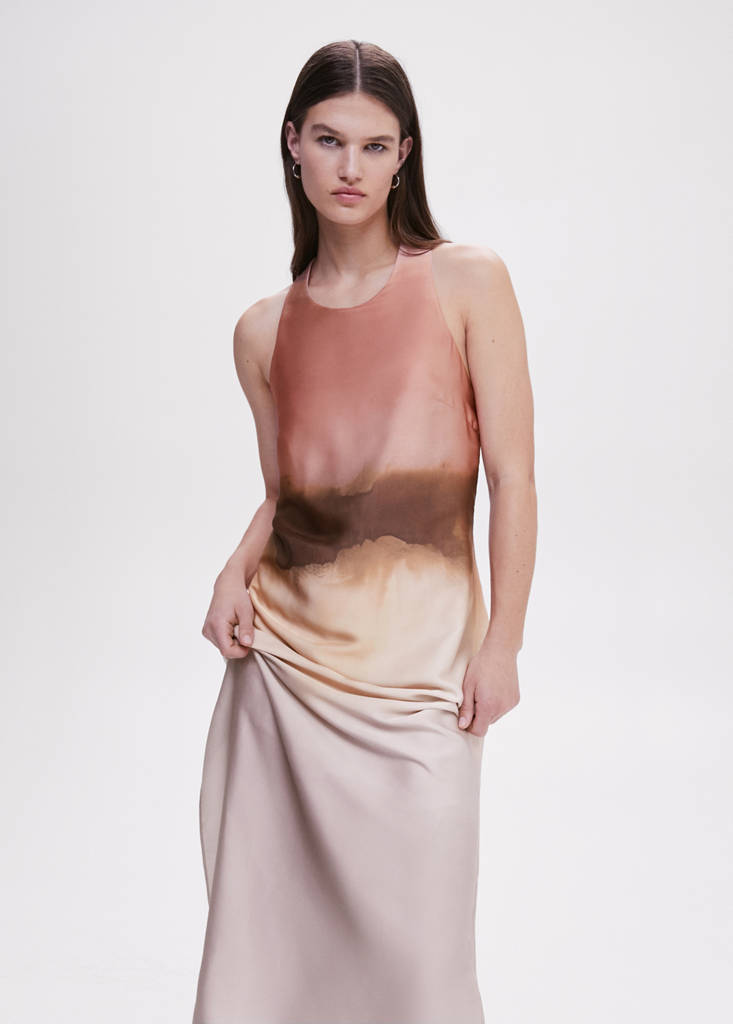 Selection Collection. Satin. Straight design. Long design. Available in plain and patterned. Rounded neck. Wide crossover straps on the back. Invisible lateral zip fastening. Party and events collection