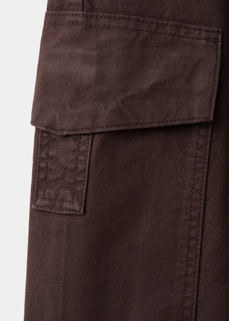Denim-style cotton fabric. Cargo design. Low waist. Belt loops. Two patch pockets and flap on the leg. Two pockets with flaps on the back. Zip closure