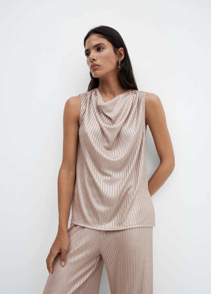 Fluid fabric. Lurex fabric. Straight design. Draped neck. Sleeveless. Button closure at the back. Total look. Party, ceremony and communion collection. Striped design. This garment belongs to our event collection, designed to make you the perfect guest at any party, wedding or ceremony