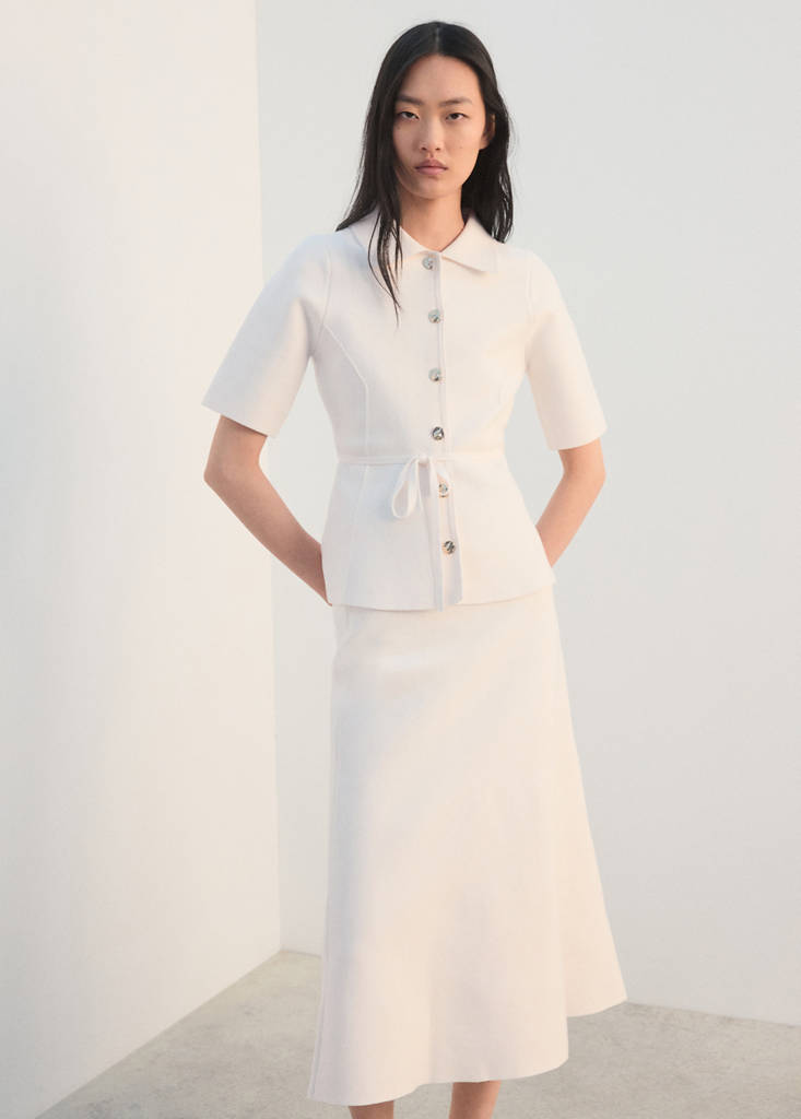 Maille fine. Coupe droite. Coupe midi. Taille mi-haute. Taille élastique. Sans fermeture. Total look.