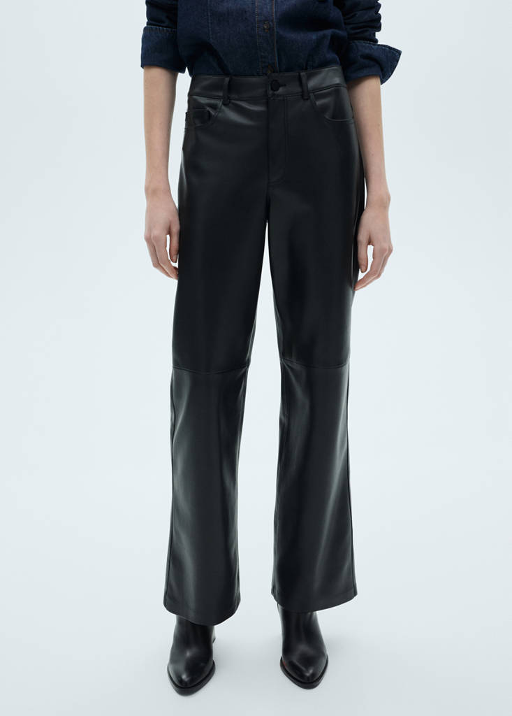Effet cuir. Coupe droite. Design long. Taille mi-haute. Passants de ceinture. Cinq poches. Détail coutures. Fermeture éclair et bouton. Doublure. Looks de bureau. Taille moyenne. Polyuréthane. Taille haute. Disponible en grande taille.