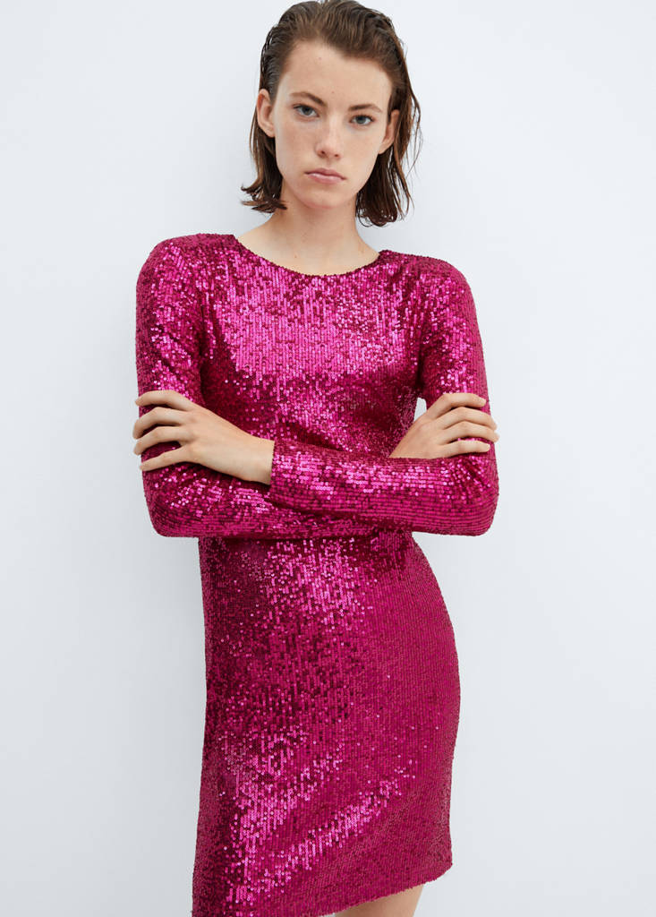 Tissu en sequins. Coupe courte. Col rond. Manche longue. Fermeture zip à l'arrière. Doublure. Coupe cintrée