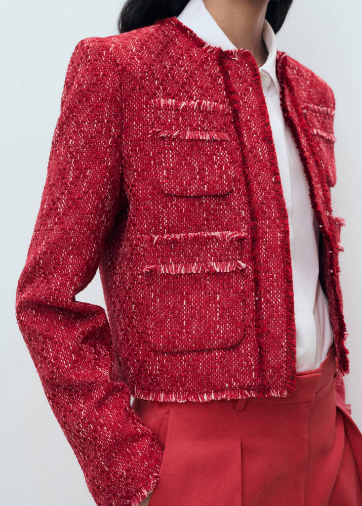 Tissu en tweed. Coupe droite. Col rond. Manche longue. Quatre poches plaquées à l’avant. Bords effilochés. Sans fermeture. Disponible en grande taille.