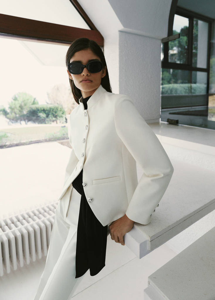 Coupe droite. Col officier. Manches longues et poignets boutonnés. Fermeture à boutons sur le devant. Deux poches passepoilées sur le devant. Doublure intérieure. Disponible en grande taille.