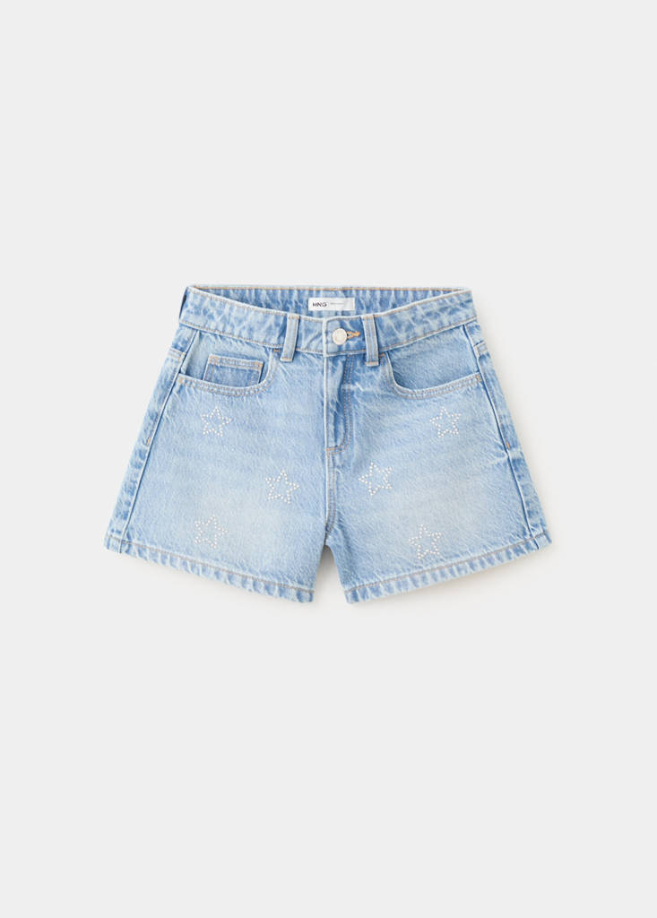 Tissu en coton style denim cowboy. Coupe droite. Coupe courte. Passants pour ceinture. Cinq poches. Fermeture éclair et bouton. Détail en strass. Détail de strass en forme d'étoile.