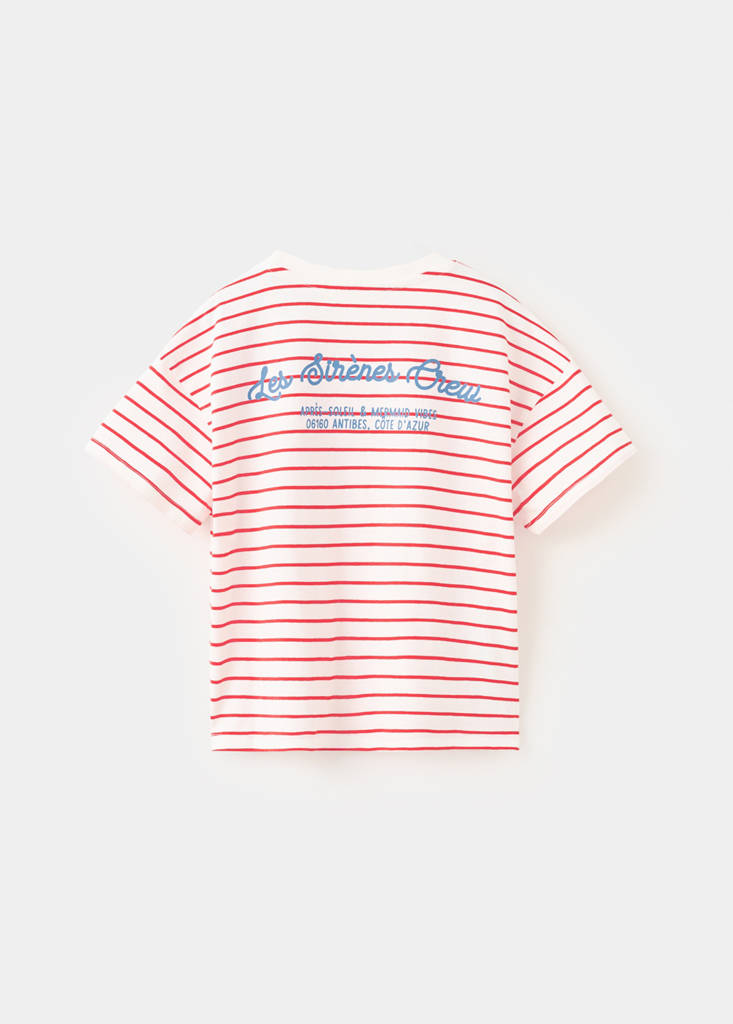 Tissu 100% coton. Tissu rayé. Coupe droite. Col rond contrastant. Manche courte. Texte brodé. Message imprimé au dos.