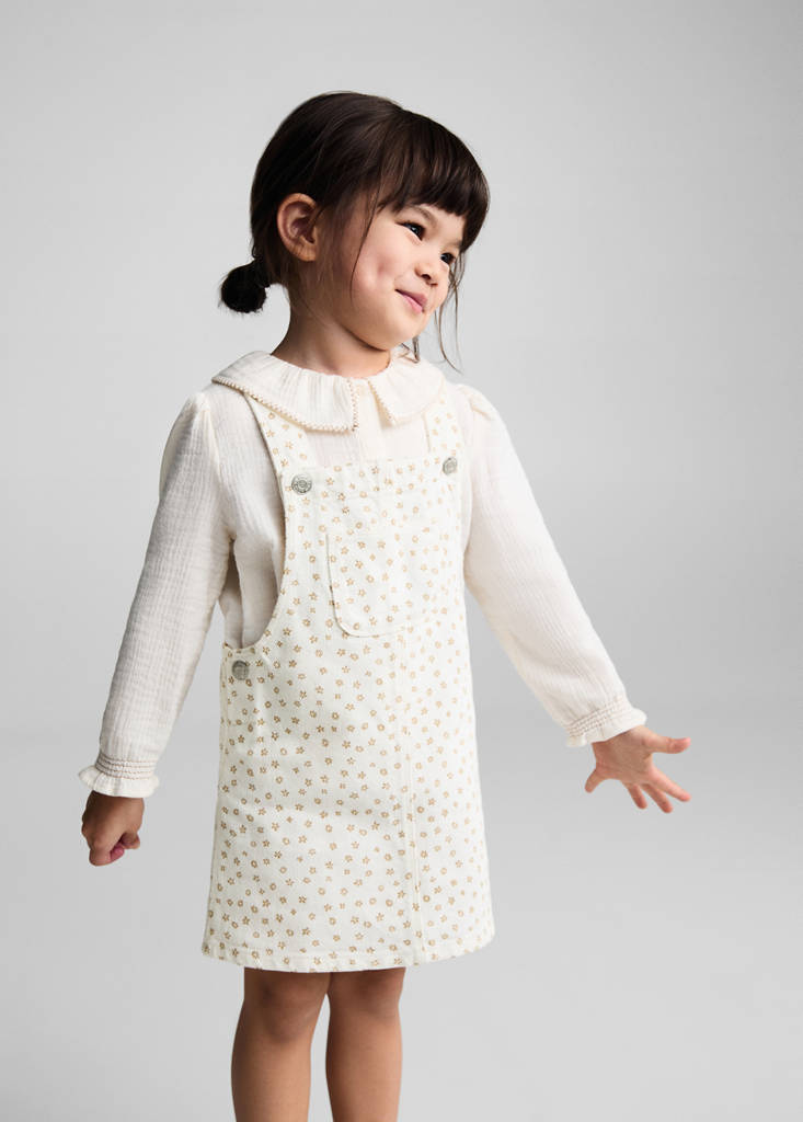 Denim-style cotton fabric. Floral print. Straight design. Short design. Straps. Patch pocket. Square Neckline. Sleeveless. Press-stud fastening. Summer camp