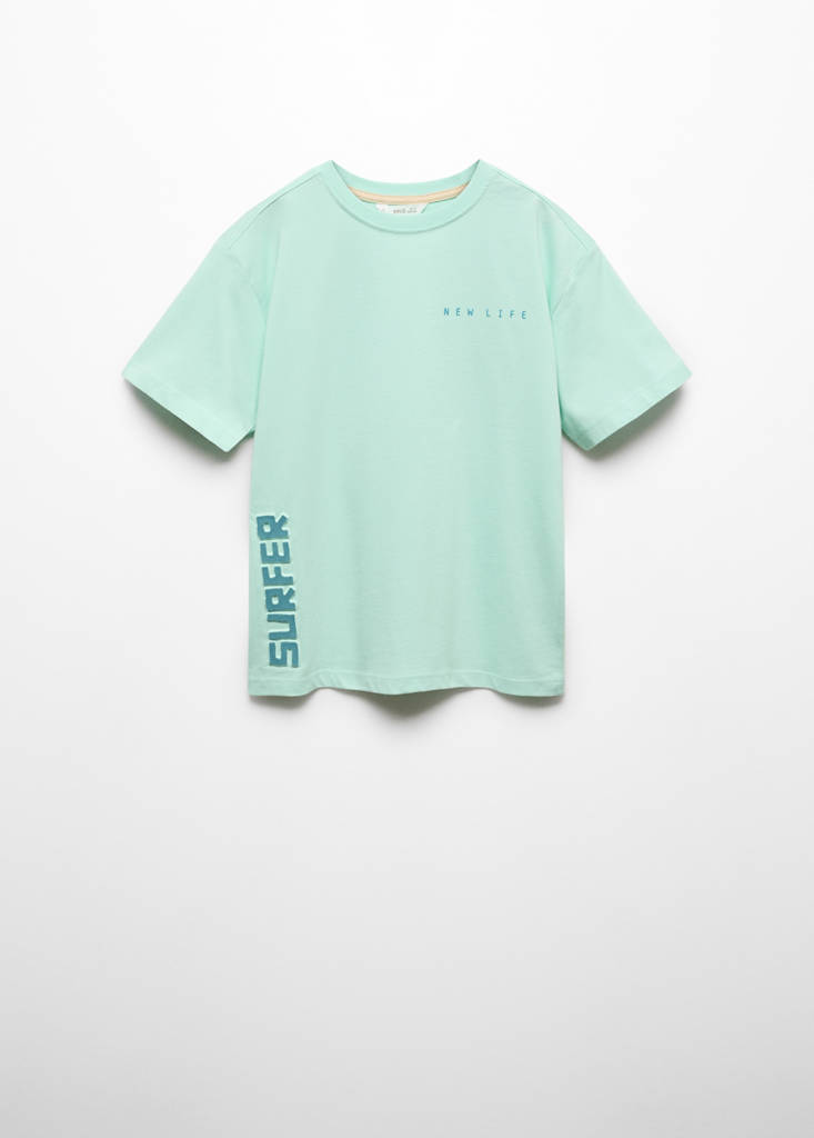 Printed design on the back. Straight design. Embossed message. Round neck. Short sleeves