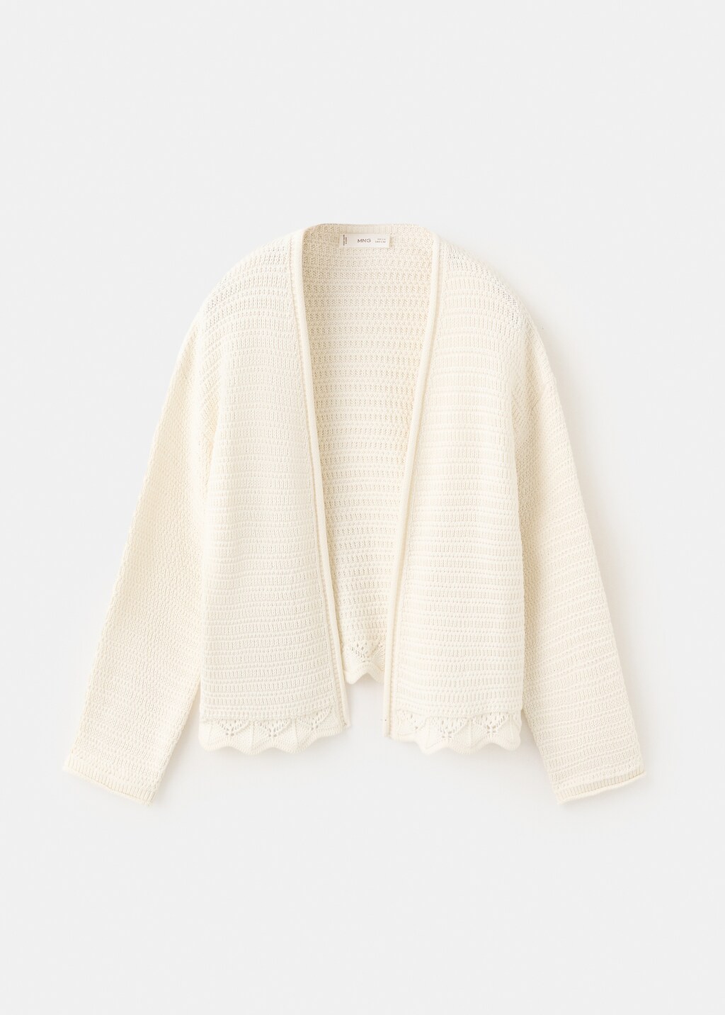 100% cotton fabric. Open-knit fabric. Straight design. Long sleeves. Scalloped details. No Fastening.