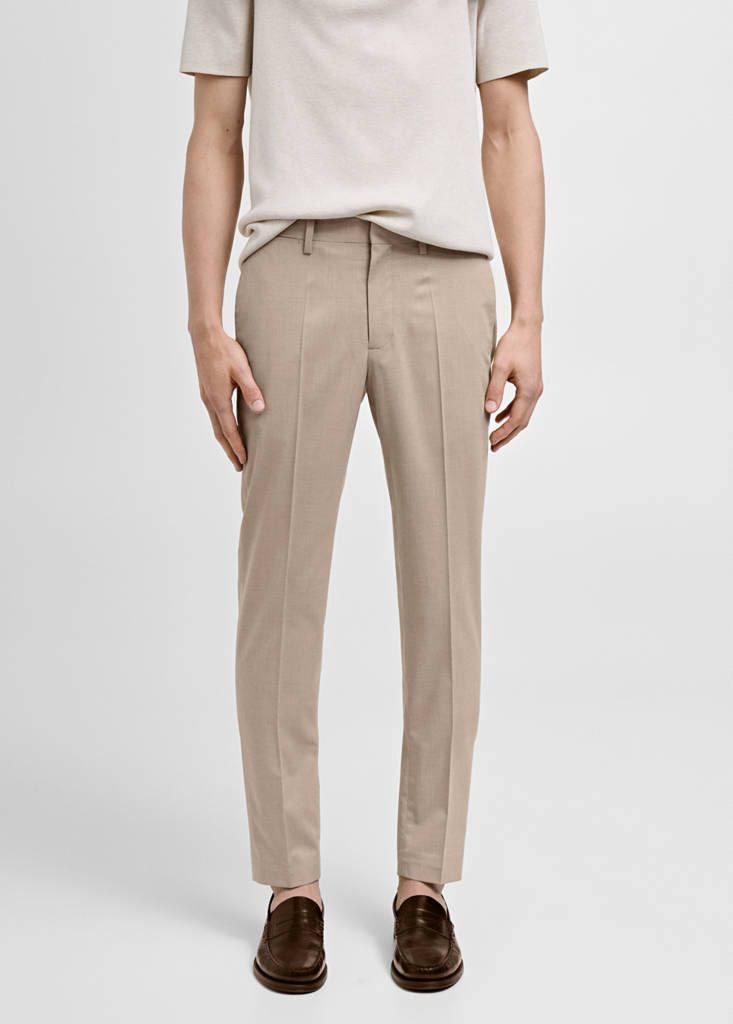Tailoring collection. Super slim fit. Comfort Stretch: Stretch fabric for added comfort. Fabric made of recycled polyester, a durable, breathable, easy-care fibre that provides comfort in use. Mid-rise. Concealed button, hook and zip fastening. Belt loops. Two side pockets. Concealed coin pocket at hip level. Two welt pockets with button at the back. Pressed crease detail at the front and back. Comfort: Horizontal and vertical stretch fabric for added comfort