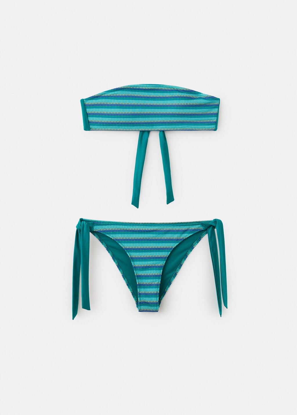 Bikini set. Stretch fabric. Bandeau design. Colourful geometric print. Bow fastening on the back. Bow detail at the waist. Adjustable tie details. Mid-rise briefs.