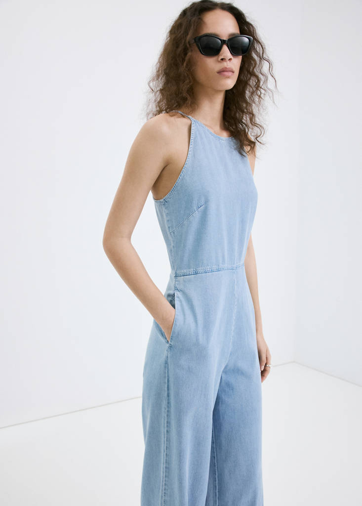Cotton and lyocell-blend fabric. Lyocell fabric in denim cowboy style. Straight design. Long design. Halter neck. Sleeveless. Two side pockets. Back zip fastening