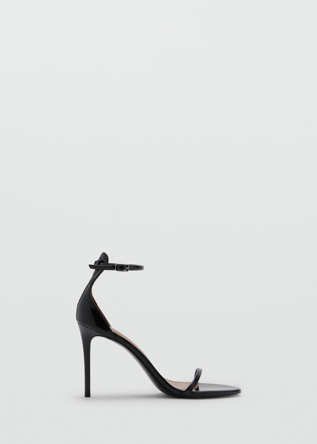 Patent leather effect. Strip design. Open toe. Stiletto heel. Ankle strap closure with metal buckle. 9.5 cm heel.