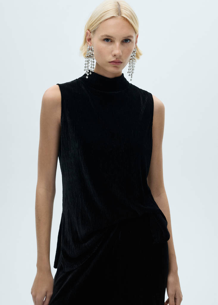 Perkins neck velvet topCurrent price [US$ 45.99 ]US$ 45.99Select a colourBlackThe model is wearing size S and is 179cm tall.Select your sizeXXSNot available. I want it!XSNot available. I want it!SNot available. I want it!MNot available. I want it!LNot available. I want it!XLNot available. I want it!XXLNot available. I want it!DimensionsNotify meAdd to WishlistSee lookFree delivery to storeVelvet fabric. Straight design. High collar. Sleeveless. No Fastening. Total look. Party, ceremony and communion collectionDetails, composition and careStore availability