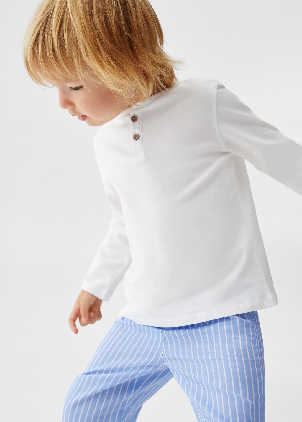 Pack de camiseta y pantalón de pijama. 100% algodón. Pantalón largo de rayas. Estampado de rayas. Diseño largo. Manga larga. Cuello redondo. Cierre de cordón.
