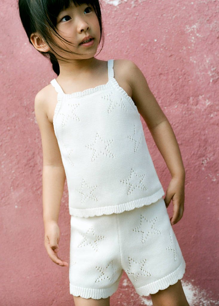Tejido 100% algodón. Detalles bordados calados. Estrellas bordadas. Cuello recto. Sin mangas. Tirantes finos. Sin cierre. Total look