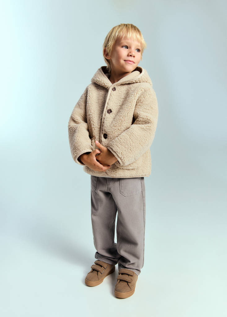 Tejido de borreguito. Diseño oversize. Con capucha. Manga larga. Cierre delantero con botones. Dos bolsillos de parche frontales
