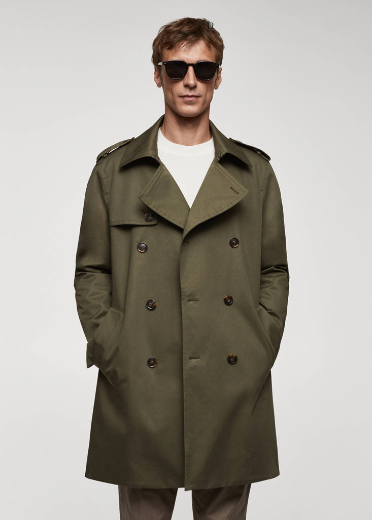ESSENTIALS: Made to last. Solapas de muesca y ojal. Cierre de gancho metálico en el cuello. Diseño cruzado con cierre delantero de doble botonadura. Trabillas decorativas en los hombros. Contrabotón interno para mayor sujeción del botón exterior. Cinturón desmontable a la cintura. Dos bolsillos de ribete con botón en la parte delantera. Manga larga. Forro interior. Abertura posterior en el bajo. Water Repellent: El acabado duradero de esta prenda protege de la lluvia ligera, repeliendo el contacto con el agua y las gotas de lluvia