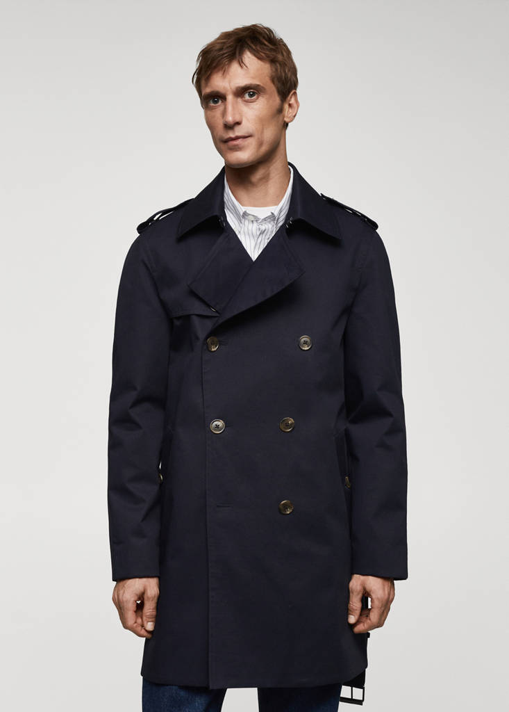 ESSENTIALS: Made to last. Solapas de muesca y ojal. Cierre de gancho metálico en el cuello. Diseño cruzado con cierre delantero de doble botonadura. Trabillas decorativas en los hombros. Contrabotón interno para mayor sujeción del botón exterior. Cinturón desmontable a la cintura. Dos bolsillos de ribete con botón en la parte delantera. Manga larga. Forro interior. Abertura posterior en el bajo. Water Repellent: El acabado duradero de esta prenda protege de la lluvia ligera, repeliendo el contacto con el agua y las gotas de lluvia
