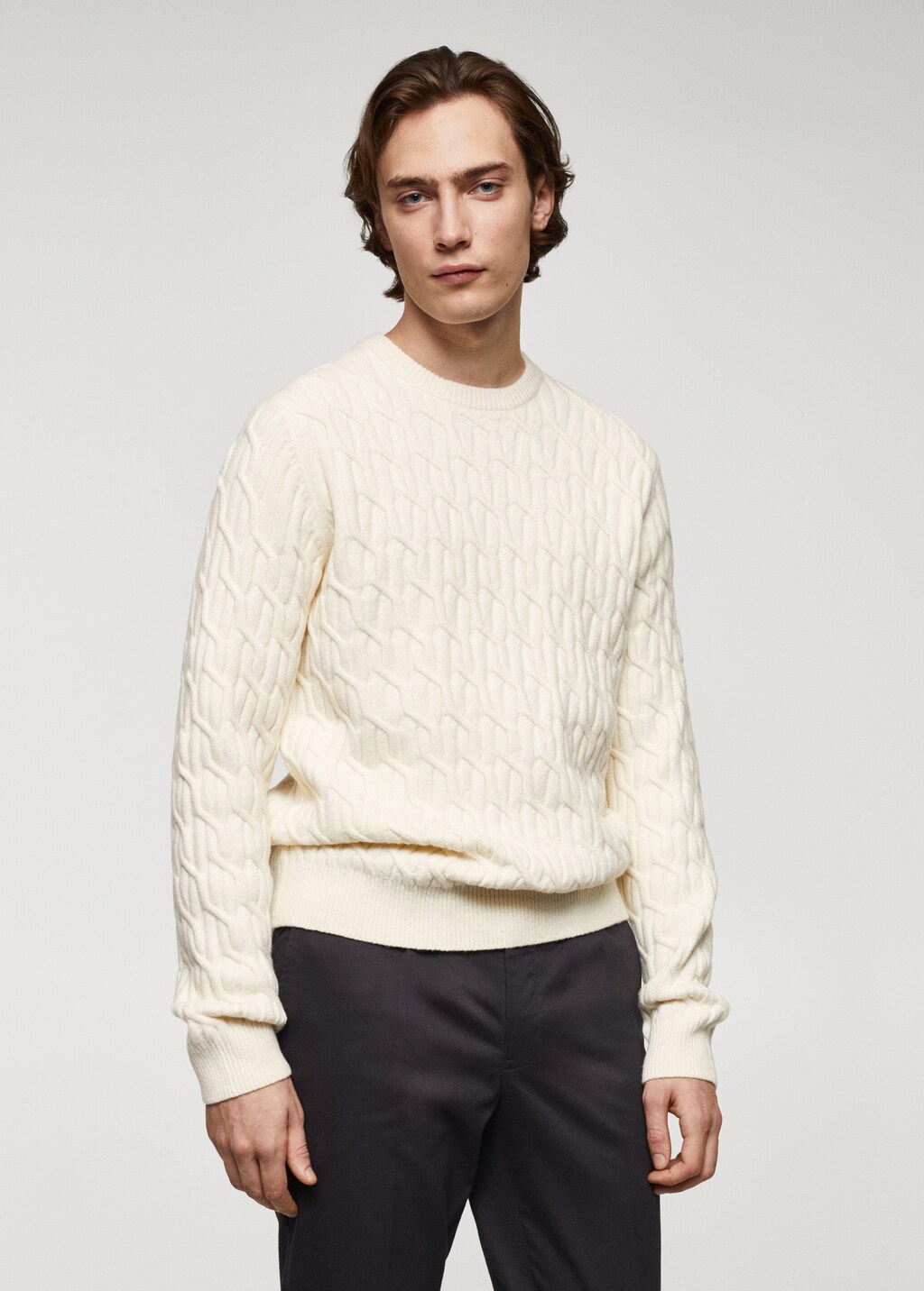 Punto medio. Diseño trenzado. Cuello redondo. Manga larga. Bajo recto. El modelo mide 190 cm y lleva una talla M. Terminaciones de canalé en cuello, manga y bajo.