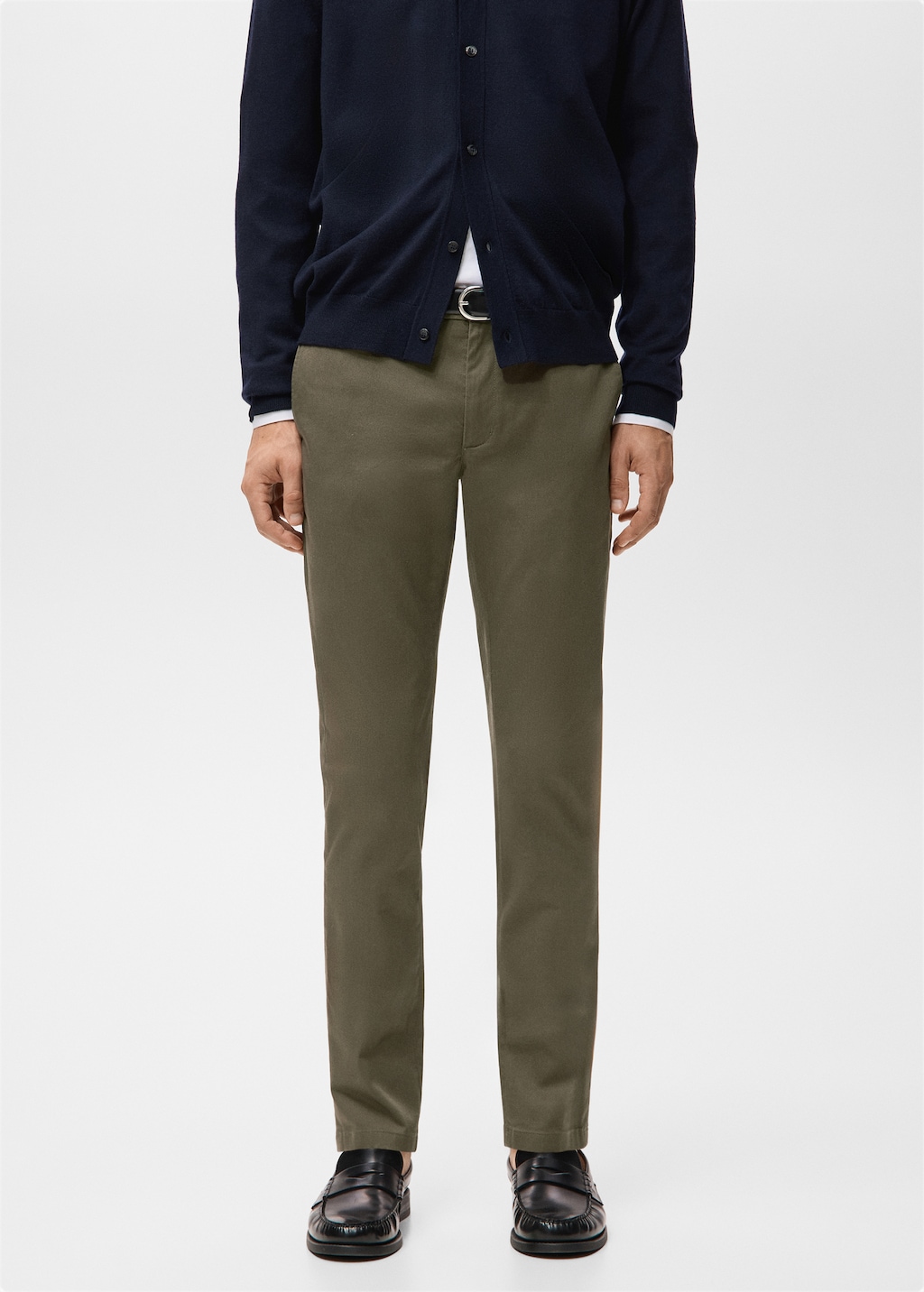 Slim fit. Estilo chinos. Tejido elástico de algodón. Trabillas para cinturón. Dos bolsillos laterales. Bolsillo portamonedas. Dos bolsillos de ribete en la parte posterior. Cierre de cremallera y botón.