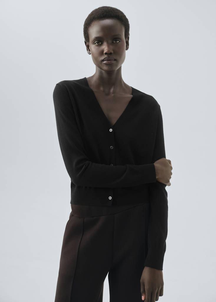Confeccionado en tejido 100% lana merino de punto fino, este diseño recto presenta cuello pico y manga larga. Tiene cierre de botones delantero. Colección Selection