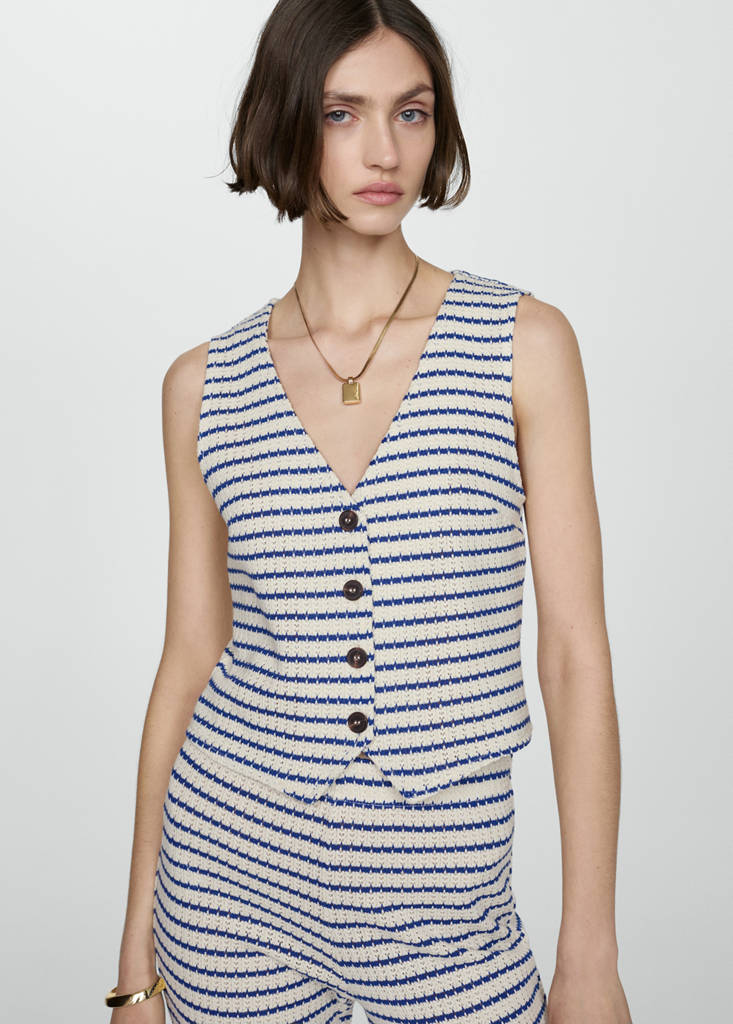 Top crochet rayasPrecio actual [$ 799.00 ]$ 799.00Selecciona un colorAzulLa modelo lleva la talla CH (EUR S) y mide 177cm.Selecciona tu tallaEECH (EUR XXS)No disponible ¡Lo quiero!ECH (EUR XS)No disponible ¡Lo quiero!CH (EUR S)No disponible ¡Lo quiero!M (EUR M)No disponible ¡Lo quiero!G (EUR L)No disponible ¡Lo quiero!EG (EUR XL)No disponible ¡Lo quiero!EEG (EUR XXL)No disponible ¡Lo quiero!MedidasAvísameAñadir a FavoritosVer lookEnvío gratis a tiendaTejido mezcla de algodón. Diseño crop. Diseño recto. Cuello pico. Sin mangas. Total look. Festival Season. Tejido de crochet. Cierre delantero con botones. Diseño de rayasDetalles, composición y cuidadosDisponibilidad en tienda