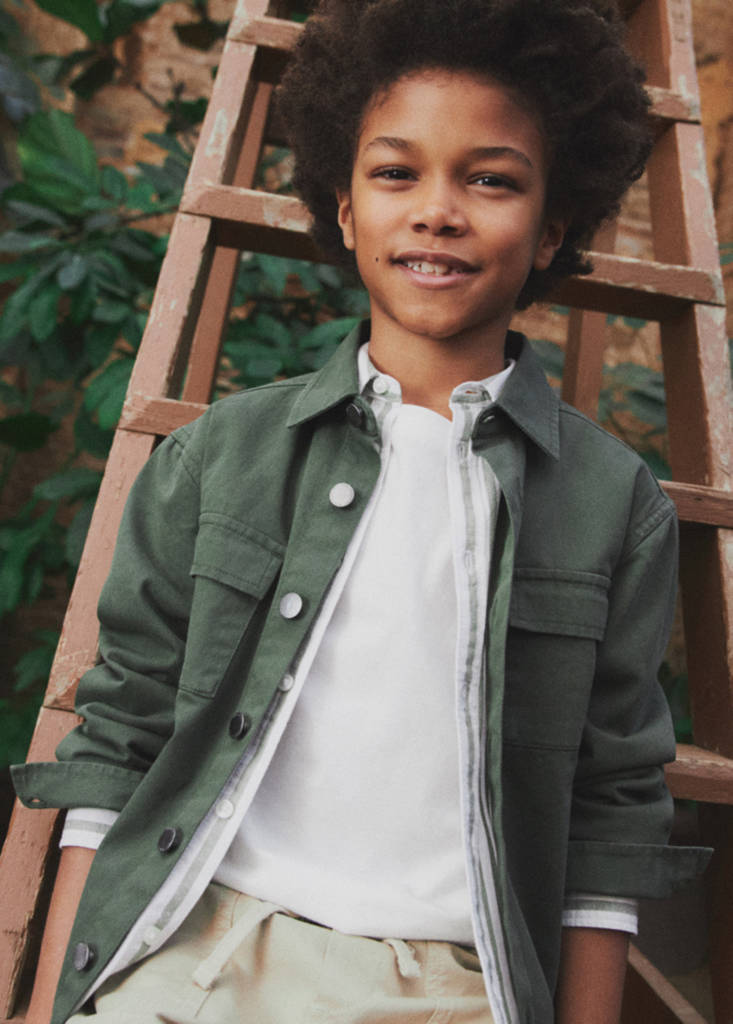 Tejido de algodón estilo tejano vaquero. Diseño recto. Puños abotonados. Dos bolsillos frontales. Cierre de botones