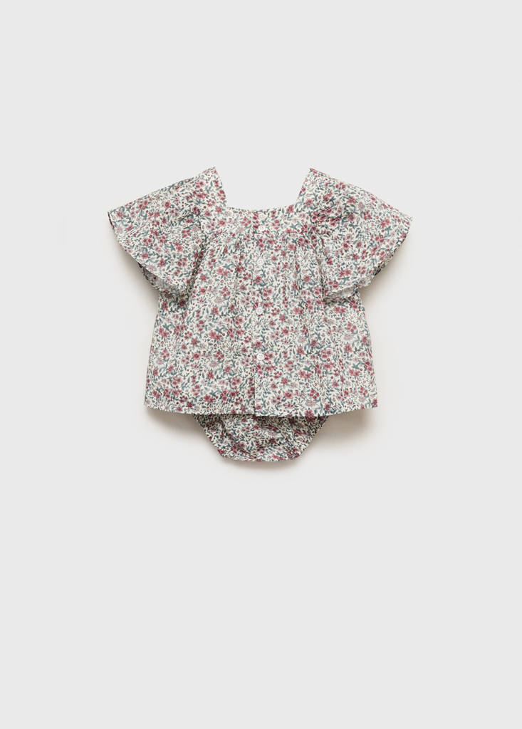 100% Algodón. Diseño recto. Diseño corto. Estampado de flores. Cuello cuadrado. Manga corta volante. Bajo con goma elástica