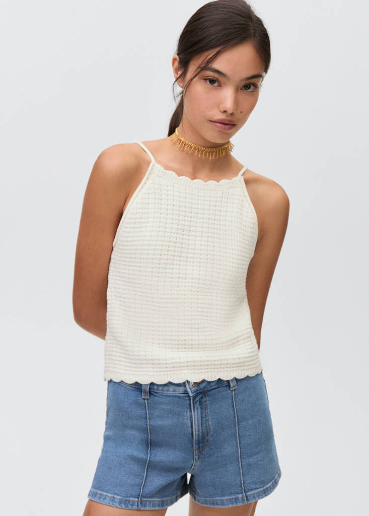 Tejido de algodón estilo tejano vaquero. Diseño recto. Diseño corto. Costuras decorativas. Trabillas. Dos bolsillos de parche en la parte posterior. Cierre de cremallera y botón. Producto en promoción