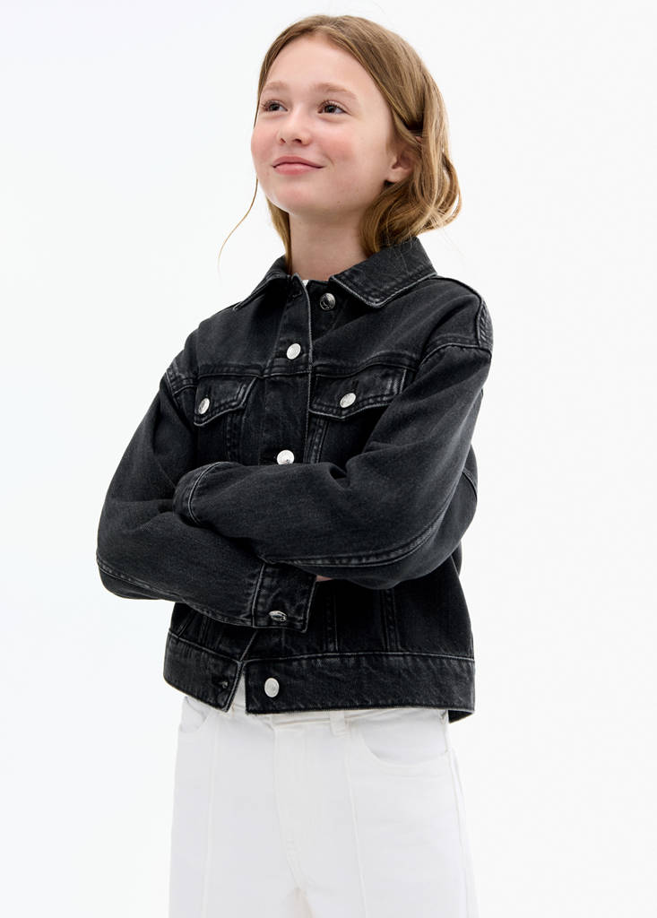 100% cotton fabric. Denim-style cotton fabric. Long design. Straight design. Shirt collar with lapel. Long sleeves. Buttoned cuffs. Front closure with buttons. Two patch pockets at the front