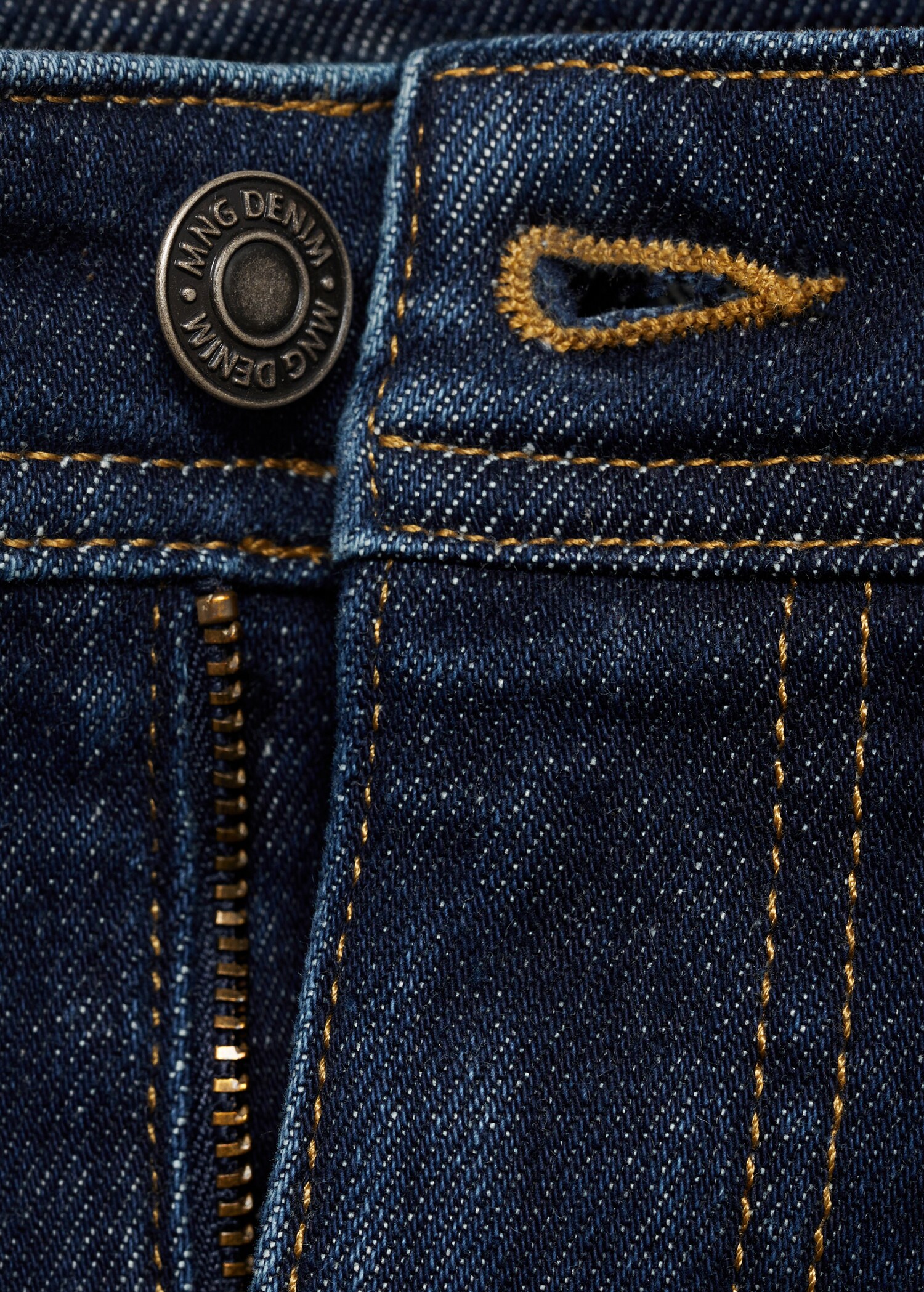 Slim fit. Cotton fabric. Denim jeans style. Button and zip fastening. Side pockets. Coin pocket. Two patch pockets at the back. Cotton fabric. Mid-rise. Dark wash. Belt loops. Zip and button fastening. Two side pockets. Standard Length. Slim Silhouette. Regular Waist.