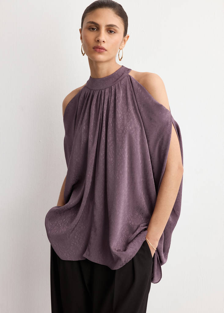 Oversized design. Printed design. Round neck. Short sleeves. Off shoulders. Neck closure. This garment is part of our party and event collection, designed to elevate your looks for special occasions
