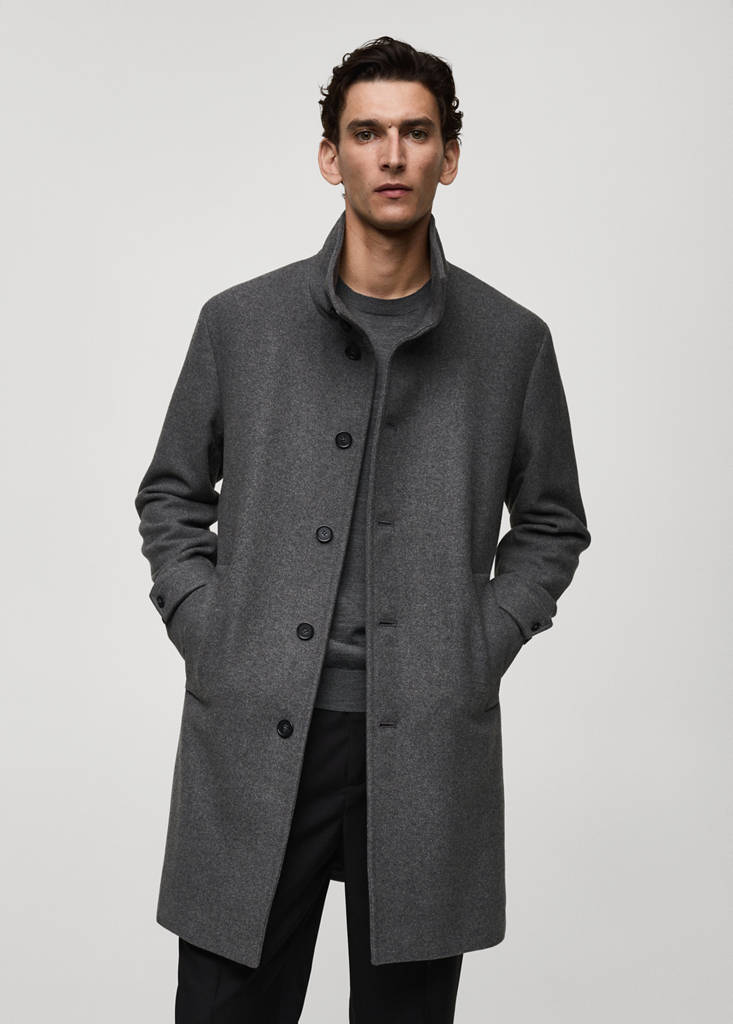 Design reto. Silhueta Reta. Comprimento médio. Tecido de mistura de lã reciclada. Gola alta de botões. Fecho de botões na parte da frente. Dois bolsos de ribete frontais. Manga comprida com punho de tira com botão. Design longo. Barra reta. Forro interior. Modelo médio