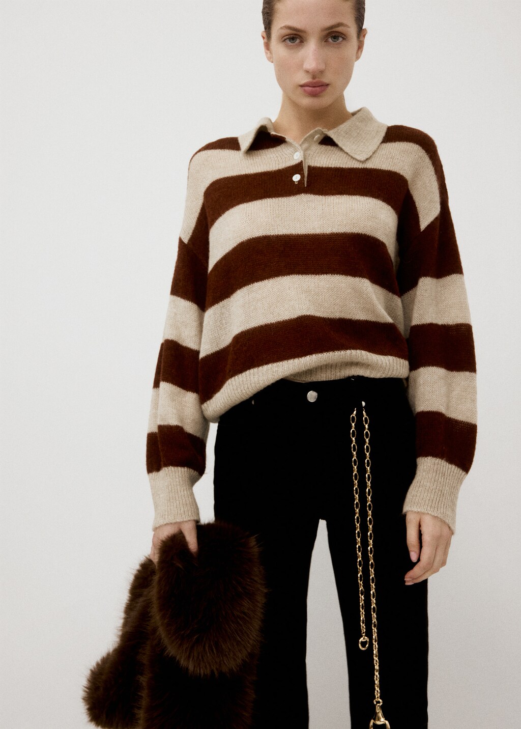 Malha de ponto médio. Tecido mistura de alpaca. Design de riscas. Design oversize. Gola polo. Manga comprida. Fecho de botões na gola.