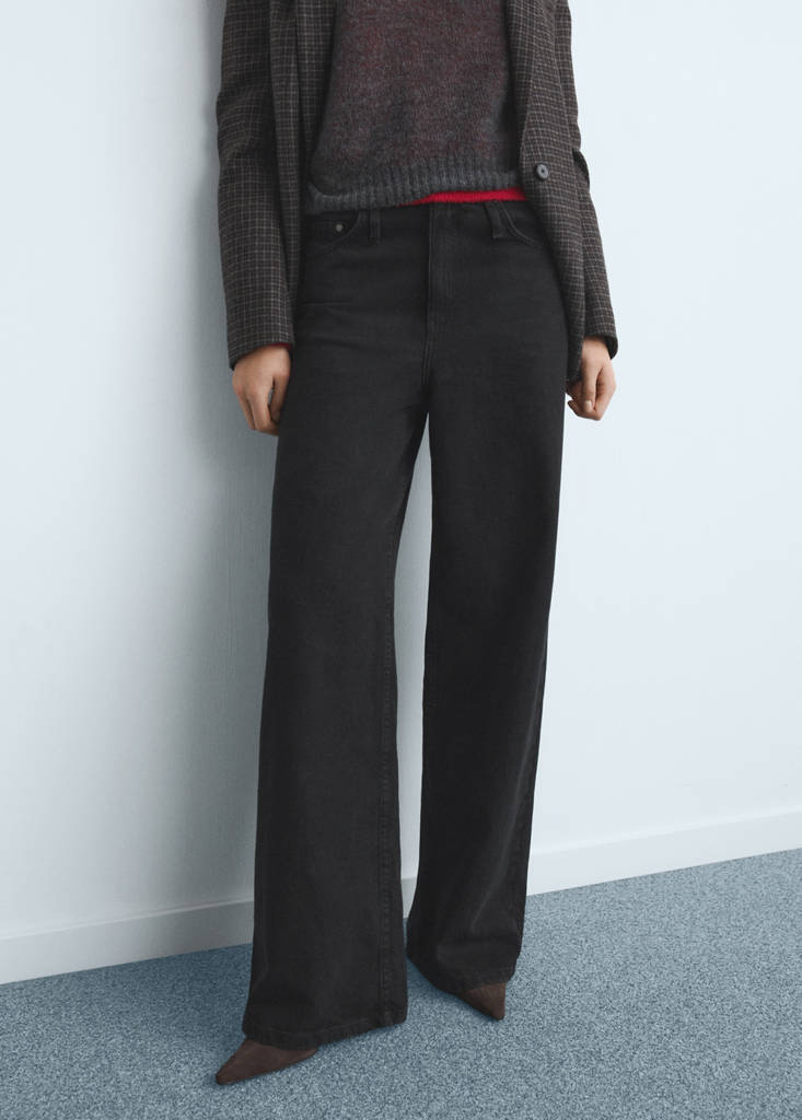 Tissu en coton style denim. Design long. Design wide leg. Taille mi-haute. Taille sans coutures. Passants de ceinture. Cinq poches. Fermeture avant à bouton, agrafe et fermeture Éclair.