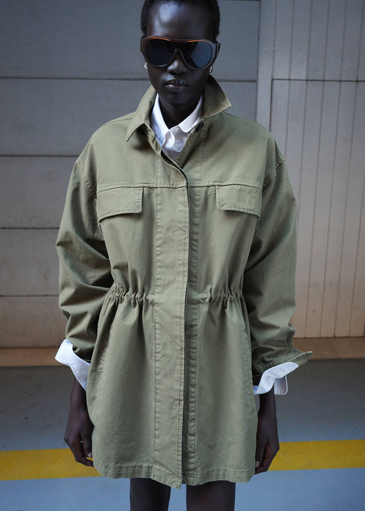 Tissu en coton style denim cowboy. Design oversize. Col chemise. Manche longue. Deux poches latérales. Deux poches à rabat sur la poitrine. Fermeture boutonnée dissimulée.