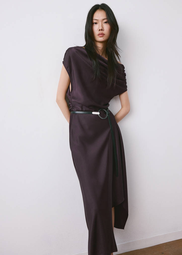 Coupe midi. Design évasé. Col asymétrique. Sans manches. Détail froncé sur l’épaule. Fermeture éclair latérale. Exclusivité en ligne. Ce vêtement fait partie de notre collection de fête et d'événement, conçue pour sublimer vos looks lors d'occasions spéciales.