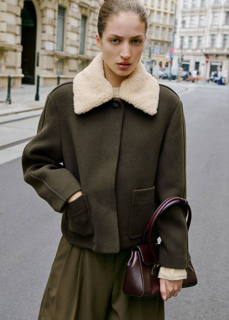 Tissu de laine mélangé. Coupe droite. Coupe courte. Col à revers. Col en imitation mouton amovible. Manche longue. Deux poches plaquées latérales. Fermeture à l’avant à boutons dissimulés. Doublure intérieure.