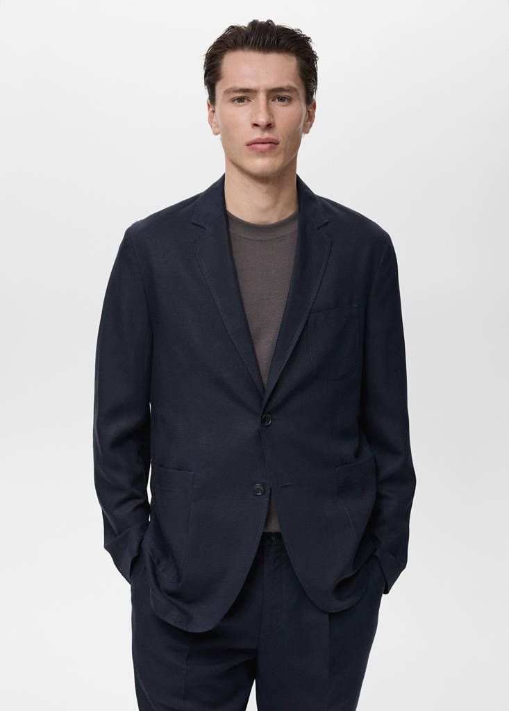 Tissu de lin et Lyocell mélangés. Collection tailleur. Slim fit. Col à revers crantés. Fermeture avant avec boutons. Petite poche plaquée sur la poitrine. Deux poches plaquées latérales