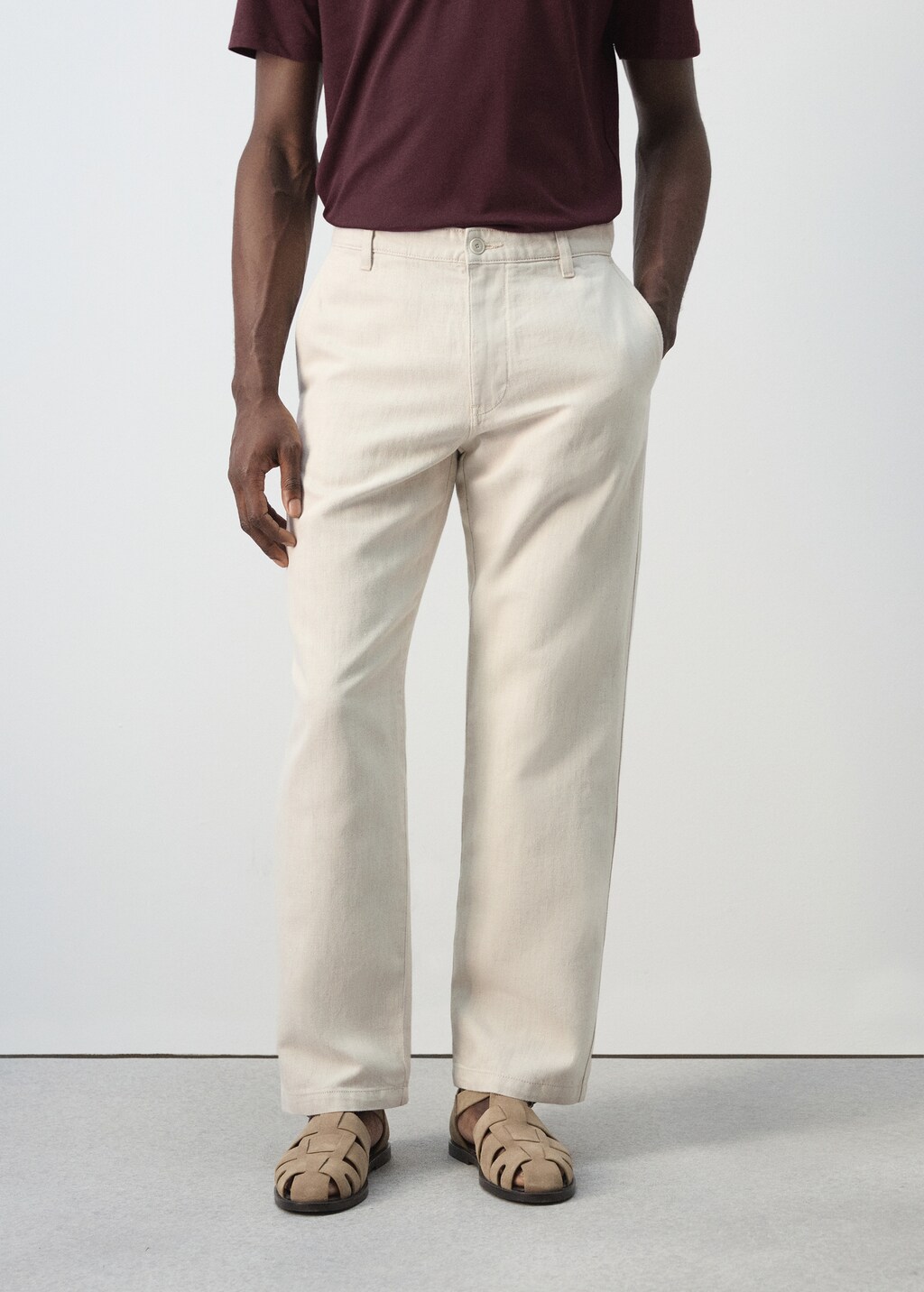 Coupe regular. Longueur standard. Tissu mélange de coton et lin. Passants pour ceinture. Fermeture éclair et bouton. Deux poches latérales passepoilées.
